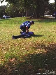 一名目击导游说:“刚才有两个客人在悉尼草坪上方便,让警察看见了。警察追他们,他们提着裤子跑。他们恼羞成怒,要打警察。警察一个过肩摔,把一个男的摔地上骨折了。现在救护车,警车都过来了。”