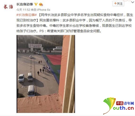 中国青年网记者就此事向武乡县职业中学进行求证,该校办公室刘老师称,目前有二十余位同学在县人民医院住院治疗。事情发生后学校领导高度重视,县领导和教育局领导也都前往医院看望生病学生。