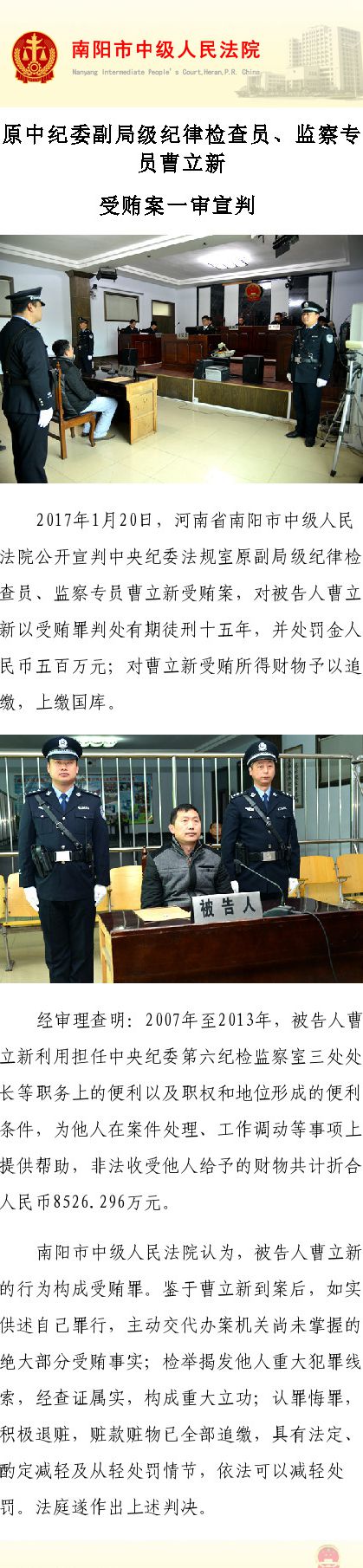 据南阳市中级人民法院官方微博消息,2017年1月20日,河南省南阳市中级人民法院公开宣判中央纪委法规室原副局级纪律检查员、监察专员曹立新受贿案,对被告人曹立新以受贿罪判处有期徒刑十五年,并处罚金人民币五百万元;对曹立新受贿所得财物予以追缴,上缴国库。