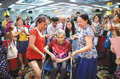 2016年7月9日,重庆双百岁老人夫妻过生日,子女们特意为他们在解放碑渝都酒店举办了一场双百盛典。图/视觉中国