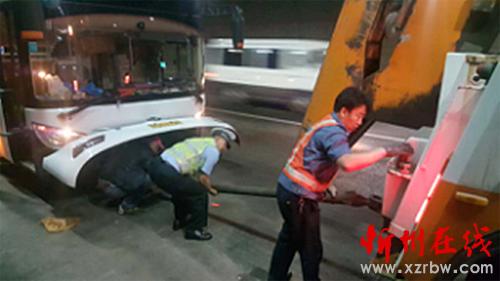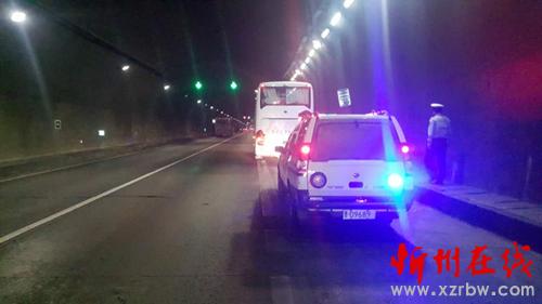 2017年5月20日14时30分许,高速二支队九大队巡逻民警翟跃、郭骐源在巡逻至五保高速凤凰岭隧道忻州方向时,发现一辆大巴车停在应急车道上,其中部分车身骑压在行车道上,隧道旁边站满了人,考虑到正处国际旅游日的返程高峰时段,路面车流量较大,极易引发二次事故,造成人员伤亡,巡逻民警一方面抓紧开始做好防护设施,一方面上前了解情况,得知这辆大巴车是从五台山去往河南方向,车上拉了40多名平均年龄五十岁左右的中老年游客,因发动机出了故障坏在路上。