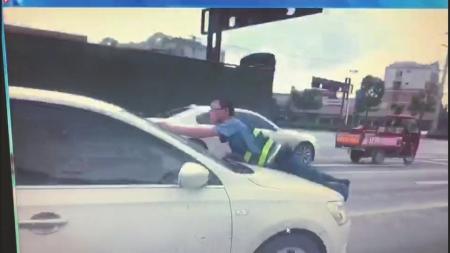黑车司机将执法人员顶上引擎盖逃跑。视频截图