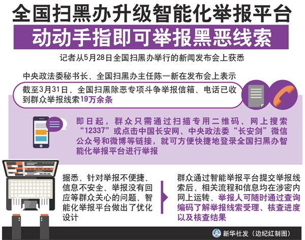 新华社北京5月28日电(记者白阳)还在担心举报黑恶线索不便捷、不安全、没回应?即日起,群众只需通过扫描专用二维码、网上搜索“12337”或点击中国长安网、中央政法委“长安剑”微信公众号和微博等链接,就可方便快捷地登录全国扫黑办智能化举报平台进行举报。