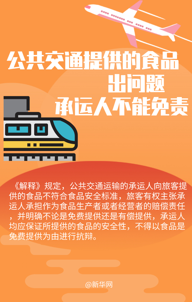 《解释》规定,公共交通运输的承运人向旅客提供的食品不符合食品安全标准,旅客有权主张承运人承担作为食品生产者或者经营者的赔偿责任,并明确不论是免费提供还是有偿提供,承运人均应保证所提供的食品的安全性,不得以食品是免费提供为由进行抗辩。