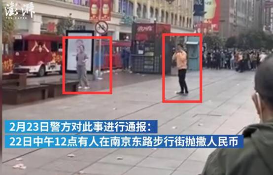 据澎湃新闻,2月22日12时左右,上海南京东路步行街有一男一女抛撒人民币,民警接到报警后,将肇事男女带走,并将地上的纸币收回。初步调查,二人系姐弟,均于2019年4月被诊断为患有精神疾病。
