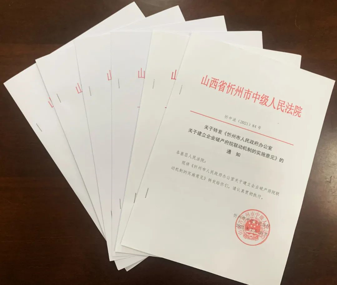 2021年7月30日,忻州市政府与忻州中院共同印发《关于建立企业破产府院联动工作机制的实施意见》。忻州正式建立企业破产府院联动工作机制,成立由市政府主要领导或受主要领导指派的分管领导和法院院长担任联席会议共同召集人,各成员单位分管领导为联席会议成员,负责统筹安排企业破产府院联动各项工作。