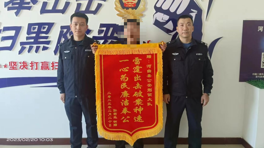 “雷霆出击破案神速,一心为民廉洁奉公。”2023年2月20日,张先生亲自将一面锦旗送到河曲县公安局民警手中,感激之情溢于言表。