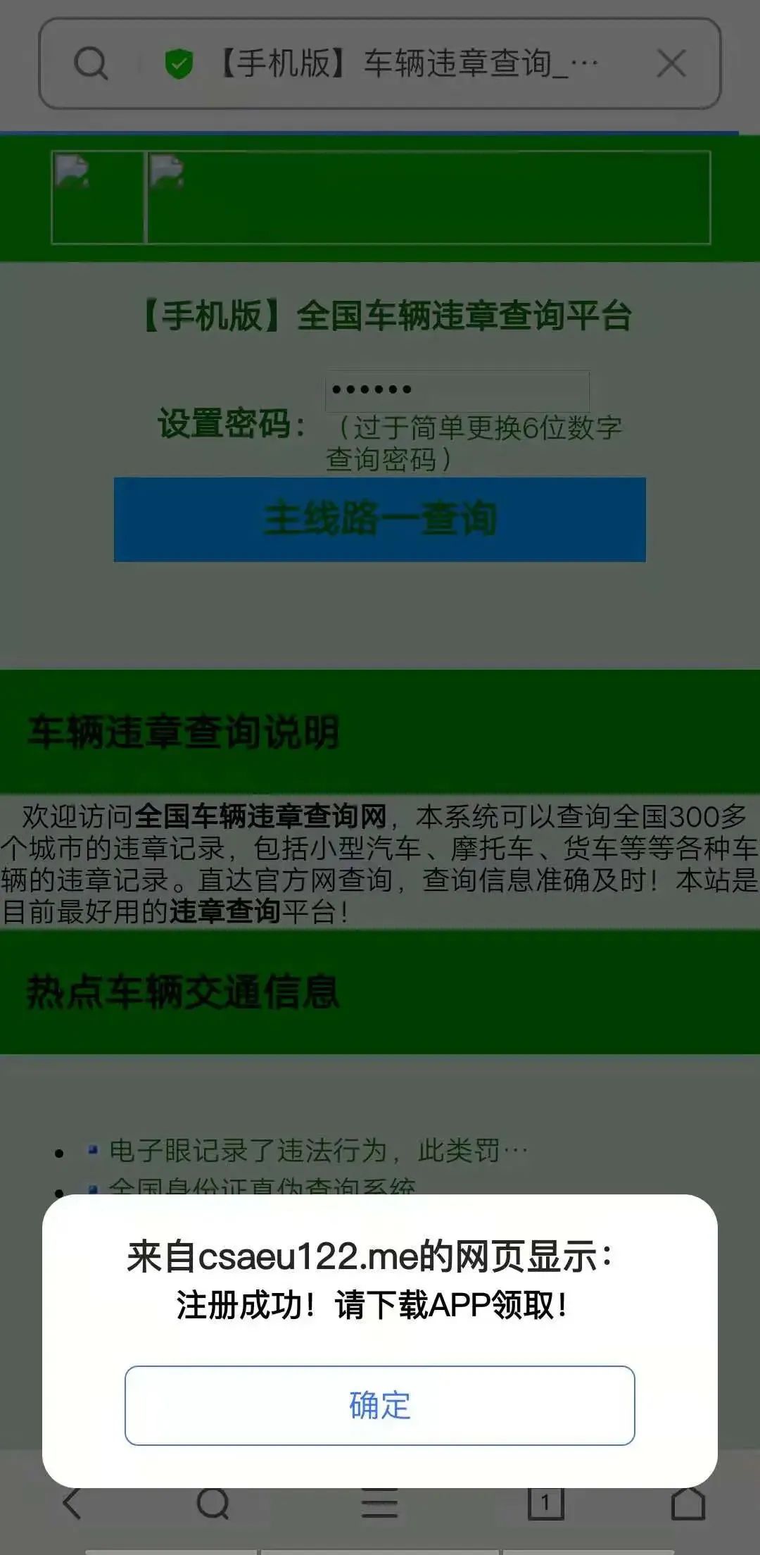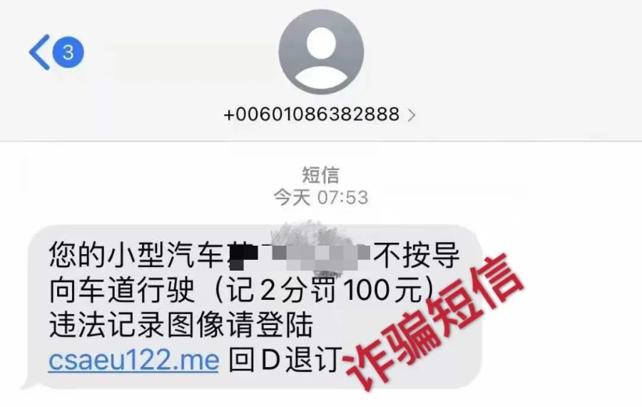第一步:获取信息。不法分子通过不正当的手段获取到受害者及车辆信息,然后通过改号软件给车主发送“违章”的诈骗短信,并在短信中附上虚假网站的网址链接。