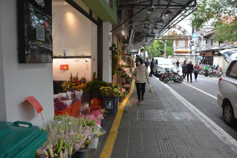 图为2月8日记者拍摄的厦门溪岸路花鸟市场,黄色实线内侧为允许商家“适当经营外摆”的区域。新华社记者颜之宏 摄