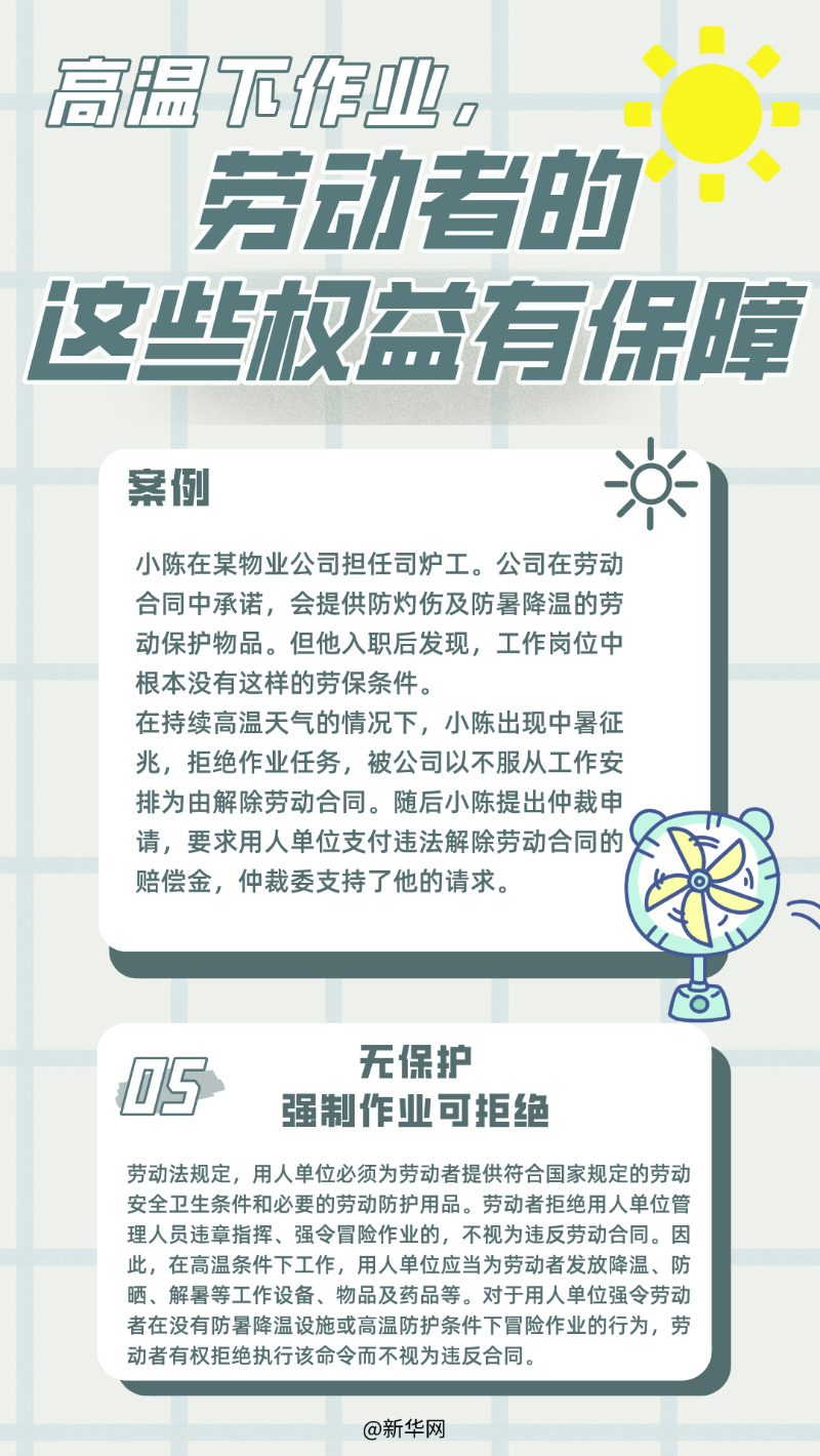 各地高温来袭,许多户外工作者依旧顶着烈日坚守在工作岗位上。向他们致敬的同时,也应关注高温作业劳动者应当享有哪些劳动权益?本期以案“视”法用以下6个案例为大家解析。