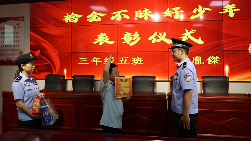近日,河曲县公安局民警带着感谢信和奖品走进黄河路小学,为拾金不昧的王同学举行了一场特别的“颁奖仪式”,用满满的仪式感鼓励同学们大力弘扬社会正能量。