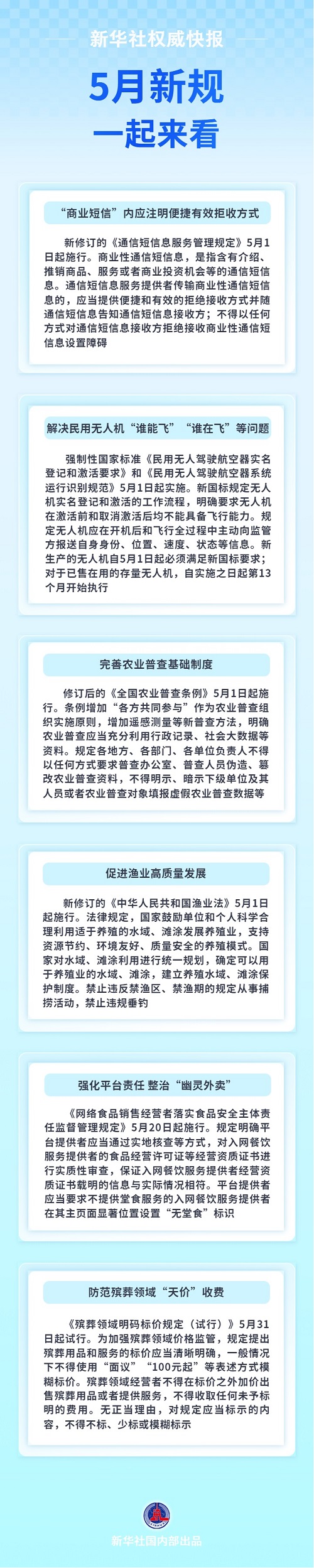 规定“商业短信”内应注明便捷有效拒收方式;解决民用无人机“谁能飞”和“谁在飞”等问题;完善农业普查基础制度……5月新规,一起来看。
