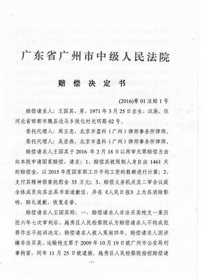 7年前,因在广州市越秀区一德路卖20支仿真枪,河北人王国其被控非法买卖、运输枪支罪,并坐了4年牢。今年2月底,他在获得了越秀区检察院的无罪认定后,申请了国家赔偿。近日,广州市中级人民法院作出决定,赔偿王国其人身自由损害赔偿金共计35 .4万元,精神损害抚慰金8万元,并在侵权行为影响范围内为其消除影响、恢复名誉、赔礼道歉。对于这个结果,王国其说,不想再折腾了,希望能尽快回归正常生活。