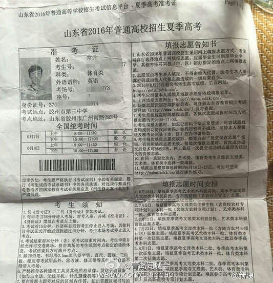 “如果不是他收到了通知书,我永远也不会知道这个秘密。”常升告诉记者,他口中的“他”是室友兼挚友郭某。常升和郭某都是体育特长生,两人今年高考成绩相仿,在填报志愿的当天,先后用体育老师迟老师的电脑填报了志愿,均为陕西师范大学的免费师范生。但是录取通知一下,常升傻了眼,自己并没有被录取,但是比自己分数更低的郭某却收到了录取通知书,而且陕西师范大学在山东招收的免费师范生还没有招满,种种情况让常升十分不理解。图为常升高考相关信息。
