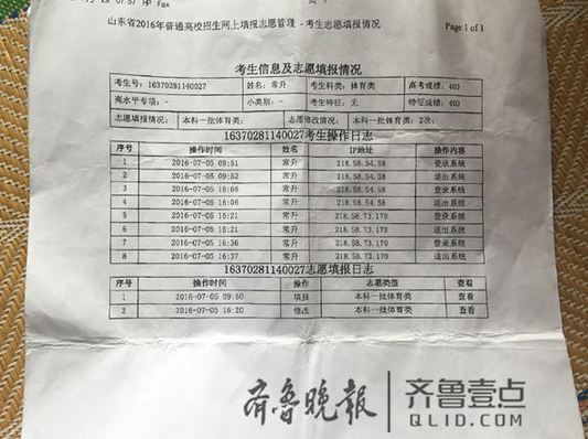 记者注意到,常升在7月5日上午9点51分登陆自己的账号填报好了志愿之后便离开,但是当天下午4点多,常升的账号再次在同一台电脑上登陆,而接下来账号又在另外一个IP地址上连续登陆两次,并且用完了两次修改志愿的机会。“我就登陆过一次,在迟老师的电脑上。”常升说,后面的三次操作他都不知道是谁所为。根据IP地址提供的线索,无论是谁修改了常升的志愿,都在迟老师的电脑上进行过操作,然后又用另一台电脑将常升的改志愿次数用完。常升的准考证和密码一直在自己手里保管,唯一有机会修改他志愿的就是自己的同窗好友郭某。“我们关系很好,我填志愿的时候他就在旁边,我也没防着他。”常升说,事发之后他找过郭某,对方也私下承认了修改了常升志愿的事实,原因则是郭某担心常升的分数更高,他怕常升挤掉自己,让自己没学上。随后,为了挽回常升的损失,双方家长进行了商谈。图为常升的账号修改志愿的记录。