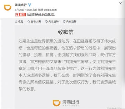 8月29日晚间,滴滴发出道歉信称,“官方微博、官方微信的文章未经刘翔同意,使用刘翔赛场上照片用于滴滴品牌宣传推广,这一行为给刘翔本人造成诸多误解,在第一时间删除了含有刘翔先生肖像的所有侵权链接,对于此次侵权行为,我们表示最诚挚的歉意。”