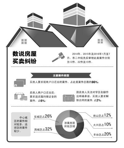 据通报,2014年、2015年及2016年1月至7月,市二中院先后审理涉及户口迁移问题的房屋买卖合同纠纷案件分别为13件、22件及15件。其中,买房人要求现有户口迁出的案件占此类案件总数的86%。该类案件中,有一半涉及了案外人的户口,除了卖房人的户口外,户口上还有他的亲戚、甚至是这套房子更早以前的房主。