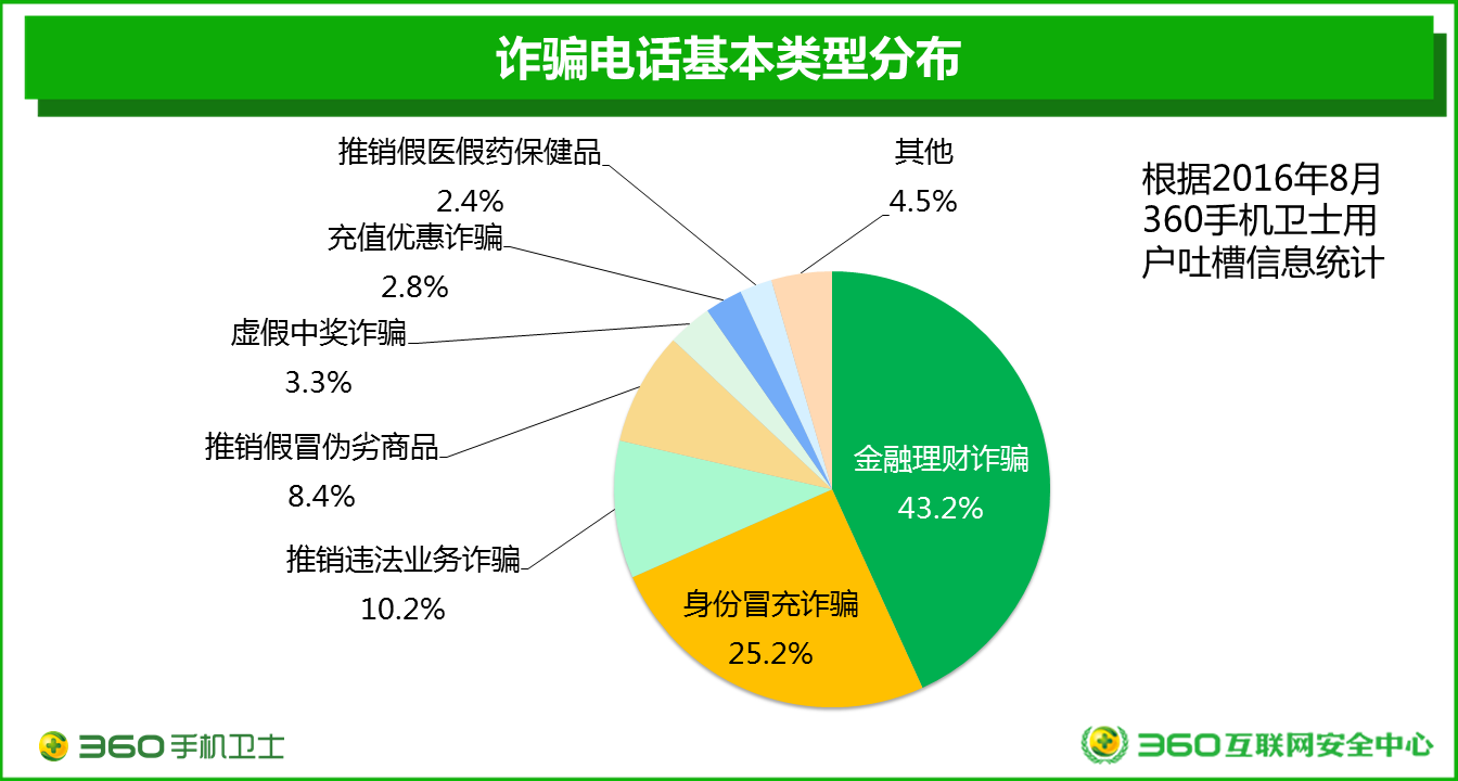 9月7日,360在京发布了国内首份基于大数据研究的电信诈骗分析报告——《2016中国电信诈骗形势分析报告》。报告中显示,在用户接到的所有诈骗电话中,虚假的金融理财诈骗最多,占43.2%,此类诈骗在北上广深等大城市尤其盛行。其次是身份冒充诈骗,占25.2%。各类虚假的业务推销电话也是被用户大量吐槽的诈骗电话类型。
