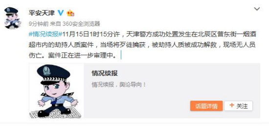 中新网11月15日电 据天津市公安局官方微博通报,11月15日1时15分许,天津警方成功处置发生在北辰区普东街一烟酒超市内的劫持人质案件,当场将歹徒擒获,被劫持人质被成功解救,现场无人员伤亡。