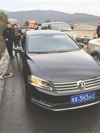 警方挡获的嫌疑人挟持人质冲关的其中一辆黑色大众轿车