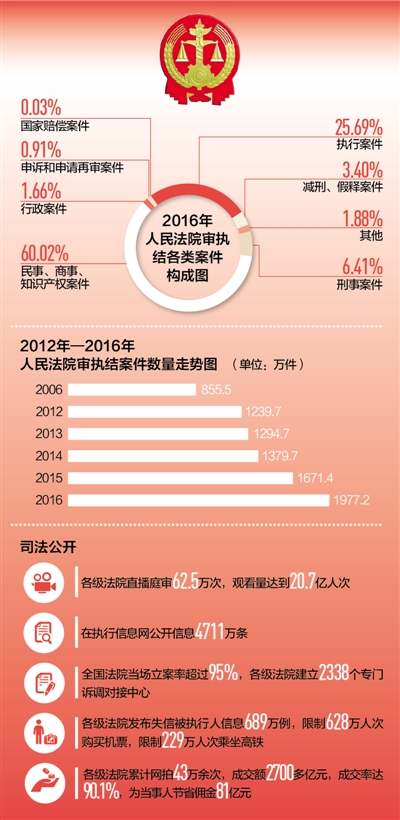 2016年,各级法院向执行难全面宣战,共受理执行案件614.9万件,执结507.9万件,同比分别上升31.6%和33.1%,执行到位金额1.5万亿元,同比上升54%。与公安部等10多个部门建立网络执行查控系统,执行法官足不出户即可依法查询被执行人财产和相关信息,实现了执行模式的根本变革。发布失信被执行人信息689万例,限制628万人次购买机票,限制229万人次乘坐高铁。依法惩治拒不执行裁判行为,司法拘留1.6万人,追究刑事责任2167人,让司法裁判真正成为惩治违法失信的利剑。