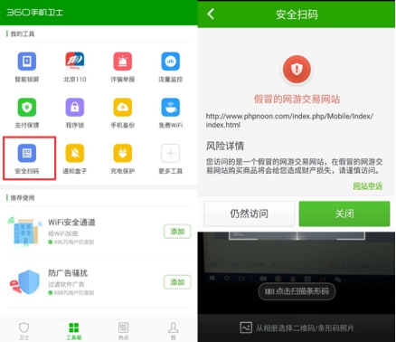 第五,使用360手机卫士等安全管理软件,通过安全扫码功能扫描二维码,识别钓鱼网站以及手机木马,保护手机安全不中招。