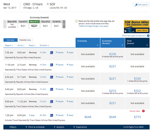 图说:记者在美联航官网搜索奥黑尔国际机场飞往肯塔基州路易斯维尔的航班。