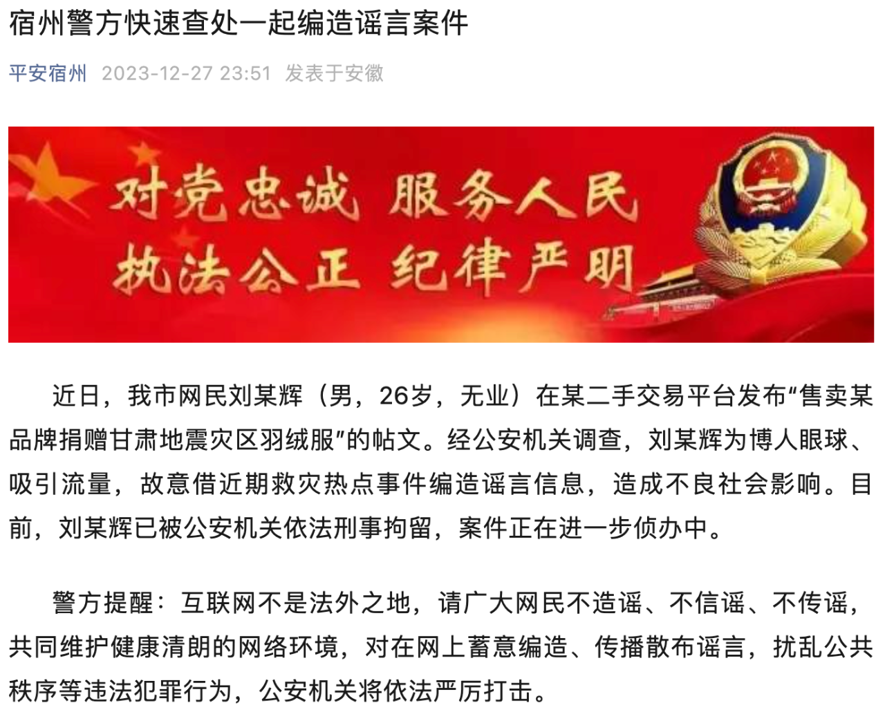 人民网北京12月28日电 (梁秋坪、高清扬)12月27日,安徽省宿州市公安局通报,近日,该市网民刘某辉(男,26岁,无业)在某二手交易平台发布“售卖某品牌捐赠甘肃地震灾区羽绒服”的帖文。