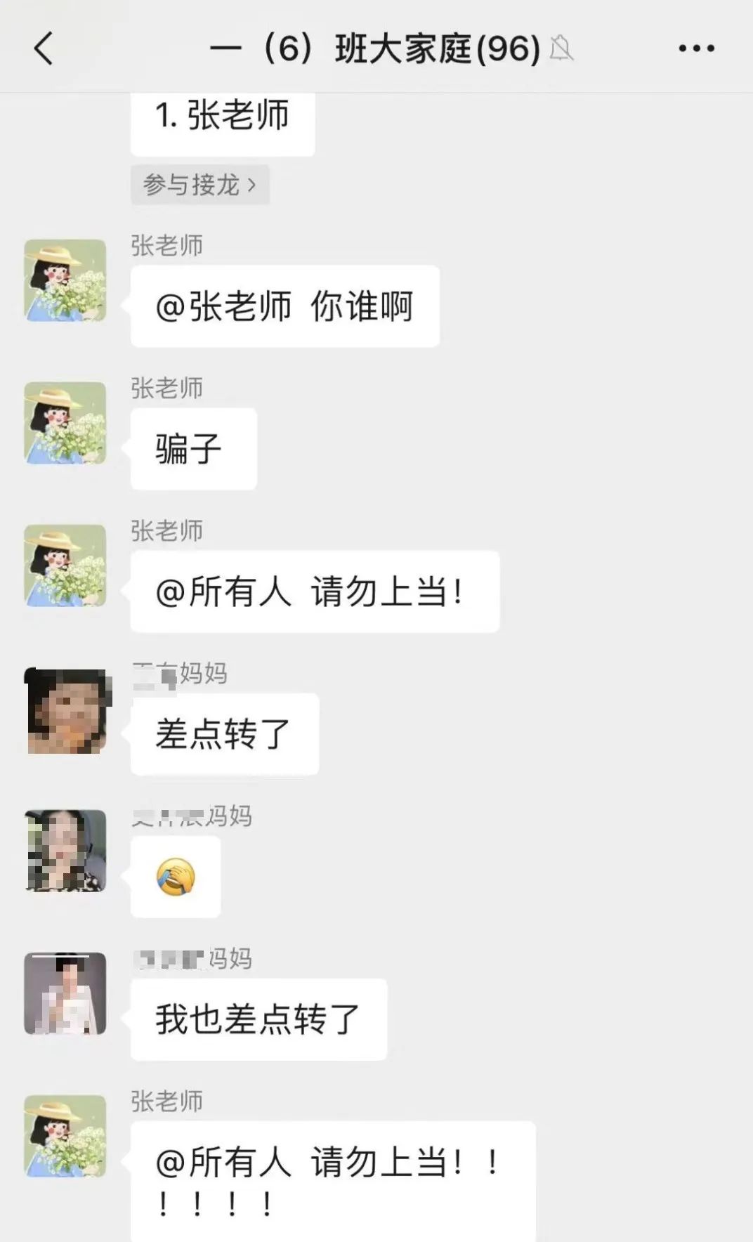 骗子通过盗取或克隆老师、家长的微信、QQ等账号,混进家长群,利用家长对老师的信任,假借老师之名,以需要缴纳服装、教材、资料等费用为由实施诈骗。