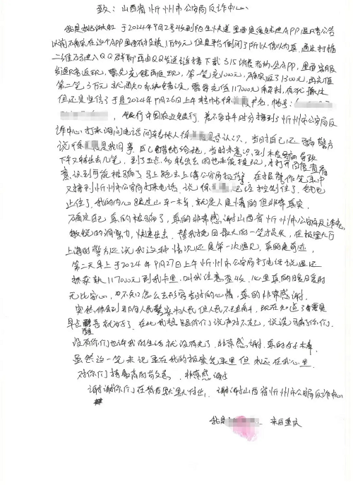 10月9日,忻州市公安局反诈中心收到了受害人亲笔写下的感谢信,信中表达了对忻州反诈民警真诚而浓厚的谢意。