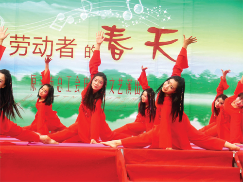 为庆祝即将到来的五一国际劳动节,原平市总工会于近日组织各基层工会的群众演员赴原平市经济技术开发区,给奋战在一线的工人师傅送去了精彩的文艺节目。图为演出现场。(贾政卿 摄)