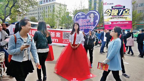 4月23日11点左右,记者在我市城区忻州一中校门口看到,一名身穿红色婚纱裙的女生举着牌子——“我妈说了,考上公务员,咱们领证去”。当天是2016年山西省公务员考试笔试的日子,这是一家公考培训机构在考点附近进行宣传活动,宣传者靓丽的外表、婚纱裙的着装和新奇的广告语吸引了很多考生的目光,甚至一些路人也驻足观看。不过,这种夸张的广告词,所谓的“考上公务员去领证”的想法是否正确,也应该引起大家的反思。(许净 摄)