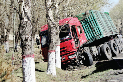 4 月20 日,记者途经五寨县三岔公路,看到一辆大货车由于驾驶员疲劳驾驶撞在了路旁的大树上,所幸未造成人员伤亡。在此笔者提醒广大司机朋友,为了您的安全,切不可疲劳驾驶。(张志远 摄影报道)