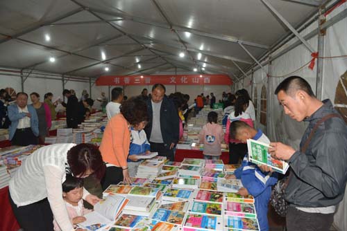 近日,定襄县金鼎广场的图书展销受到广大群众的热烈欢迎,主办方专门设置了阅览区,群众不仅能享受图书折扣,还能免费阅览所有图书。此次活动是定襄县“我的中国梦,书香飘万家”全民阅读推广主题活动之一,为期15天。图为5月12日,群众在书展上购书阅读。(刘小苗)