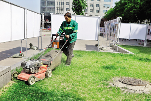 近日,城区日月广场上,园林工人正在对草坪进行修剪。随着气温增高,雨水充足,草坪和路边的灌木生长茂盛,园林工人及时对草坪、灌木进行修剪,保证了城区绿化带干净整洁。(张志远 摄)