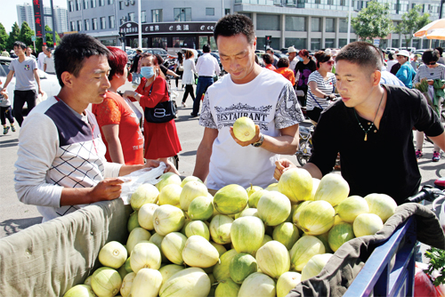 5 月29 日,原平市王家庄乡弓家庄村的农民正在农贸市场销售大棚香瓜、蔬菜。近年来,该市加大财政扶持力度,加快产业结构调整,大力发展蔬菜大棚。目前,该村户均1座大棚,人均产值1.5 万元。(褚震 摄)
