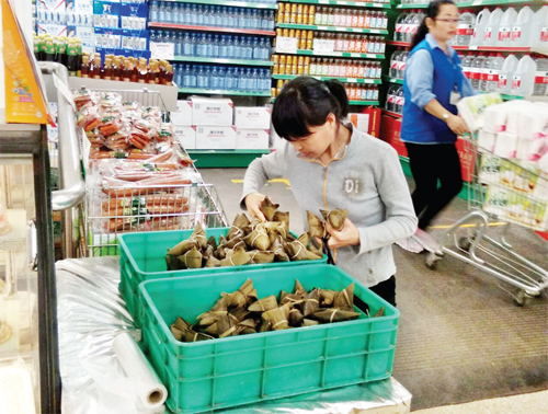 6月2日,市民在城区超市里买粽子、挑粽叶(张志远 许净 摄)