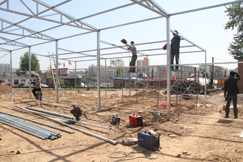 6月2日,原平市新原乡柳巷村花农新建的花卉博览大厅开始焊接钢架,大棚建成后,可扩大花卉分区分类摆放,使消费有了更好的花卉欣赏、选择空间。成为原平最大的花卉超市。(褚震 摄)