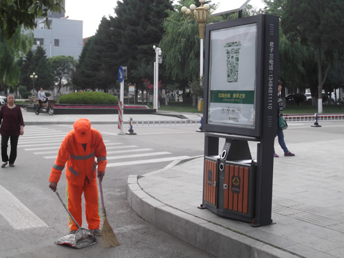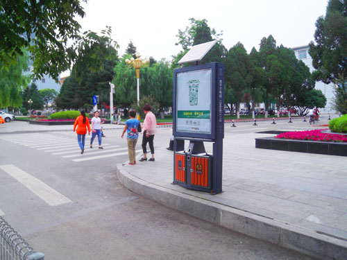 6月4日太阳能果皮箱亮相原平市街道两旁。该市引进的新型太阳能环保亮化分类果皮箱,带有太阳能发电,晚上自动亮灯照明,方便垃圾处理、回收利用,受到群众欢迎。(赵春晓 摄)