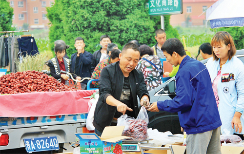 6月5日,原平市民正在选购红枣包粽子。眼下,猴年端午节即将来临,原平市场洋溢着浓厚的节日气氛,端午粽是必不可少的节日佳肴,家家户户购红枣、黄米、粽叶,自己动手包粽子,欢欢喜喜过节日。(吉建平 摄)