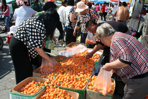 6月12日,被誉为大杏之村原平市解村乡余家沟村的农民正在集贸市场卖大杏,市民们正在挑选购买很受青睐。该市大力发展一村一品水果种植栽培业,多措并举促进了农民增收。(赵春晓 摄)