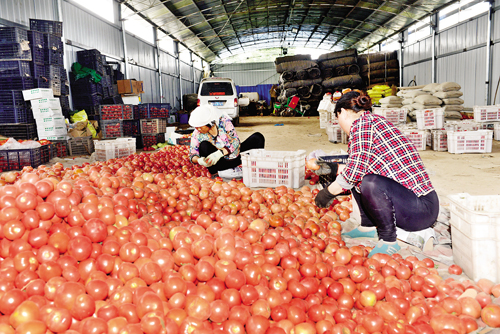 6 月22 日,定襄县受禄乡富达农业合作社的农户们将采摘的西红柿装筐准备外销。近年来,定襄县立足自然资源优势,积极引导农民调整产业结构,大力发展设施农业,促进了农业增效、农民增收。(张玉虎 摄)