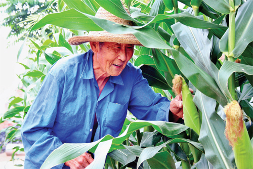 7 月4 日,原平市武彦村老农看着长势喜人的玉米喜上眉梢:如今惠农政策真是好,调动了俺们的种田积极性,利用科技种的玉米,长得好,结穗早,收入高,看着真开心。(赵春晓 摄)