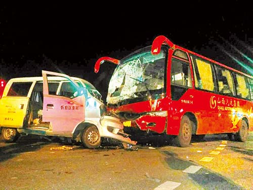 本报讯 7月10日22时20分左右,在忻州城区慕山桥北端的十字路口,一辆城际客运汽车与一辆面包车相撞,客运汽车前挡风玻璃粉碎毁损,面包车前部严重变形,面包车上的伤者被随后赶到的救护车送往医院抢救,交警接警后也在第一时间赶赴现场调查事故原因、处理毁损车辆。