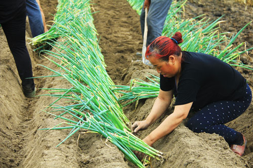 7月9日,原平市小河村民正在小麦收割田里回茬栽大葱。原平市调整种植结构,适应市场变化收到了较好的效果。在平川地区,根据无霜期时间长,大力发展两茬田种植,粮食与蔬菜得到均衡,既确保增产和市民菜篮子蔬菜供应,又促进了农民增收。(吉建平 摄)