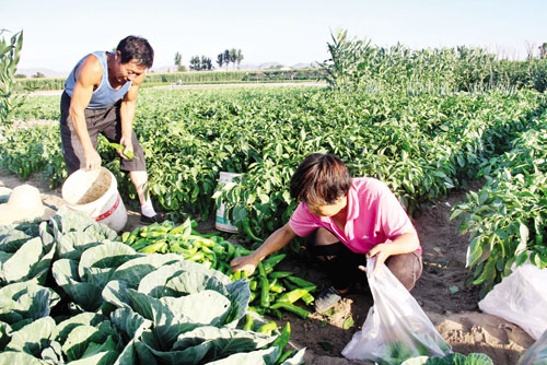 7月13日,原平市新原乡解放街村农民将收获的青椒销往市场。该市积极引导城郊农民利用地理优势,大力调整种植结构,加大特色农业开发力度,因地制宜种植紫甘蓝、青椒等新鲜无公害蔬菜,不仅丰富了市民的菜篮子,而且鼓起了菜农的钱袋子。(褚震 摄)