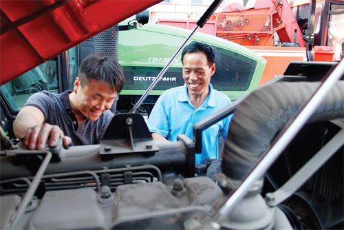 7 月13 日,两位农民在原平市农机公司选购拖拉机。近年来,原平市落实各项惠农政策,极大地调动了农民购买和使用农机具的积极性,在小麦收割接近尾声之际,农民抓紧时间选购拖拉机等国家补贴农机具,为在麦田地里进行夏播做准备。(褚震 摄)