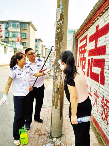 记者在利民西街看到,城管队员手拿喷水器、小铲子,对路边电杆、墙壁、公交站牌等处的“小广告”逐一认真清理。不少“小广告”由于粘贴得比较牢靠,队员们用手撕扯后再冲洗,但被粘贴的位置依然留下了斑斑痕迹,再一次经过重复操作,“小广告”才被彻底清除。图为工作人员正在清理“小广告”(张志远 摄)