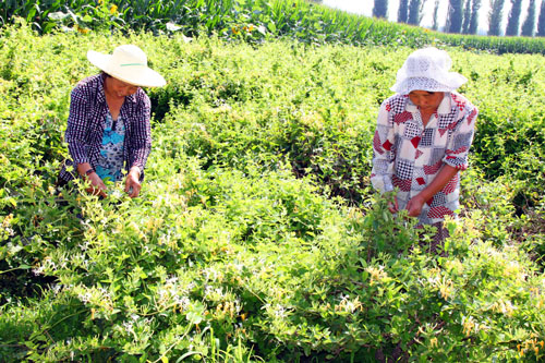 7月28日,原平市桃园村农民正在采摘满地盛开的金银花,他们高兴地说“种的金银花,如今有钱花。该市积极引导农民调整农业生产结构,大力发展特色高效种植业,促进农业增产,农民增收, 加快了脱贫致富达小康步伐。(赵春晓 摄)
