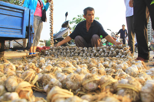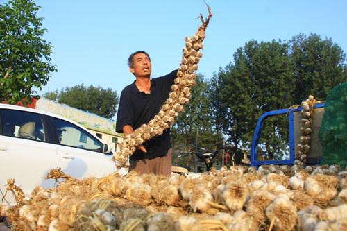 7月30日,原平市阳房村蒜农正在农产品市场销售紫皮蒜。原平紫皮蒜是当地的品牌农产品,盛产于滹沱河沿岸的新原乡和西镇乡,不仅是调味佳品,而且食用具有药用价值,省内外客商慕名而来购买,深受欢迎。(吉建平 摄)